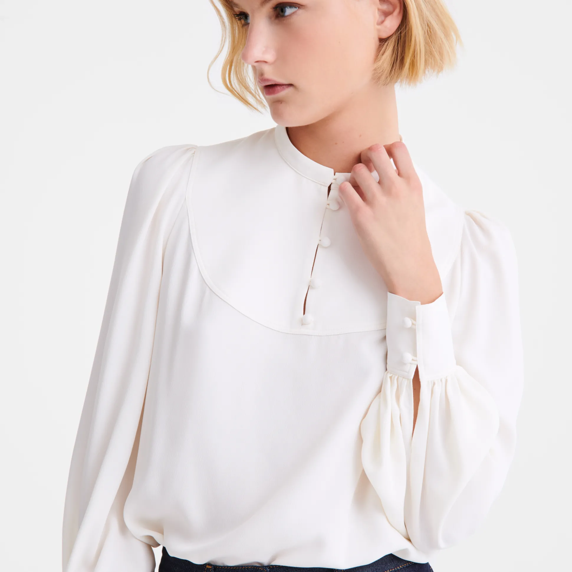 Questa blusa in seta riprende i codici raffinati dell’abbigliamento formale, apportando un tocco di femminilità con il suo design fluido. I bottoni e i polsini rivestiti in tessuto conferiscono un’eleganza senza tempo, rendendola un’aggiunta versatile a qualsiasi guardaroba. Questa stagione, la collezione prêt-à-porter della Maison sprigiona un’energia fresca e vitale che richiama uno spirito libero e senza limiti. Ogni creazione riflette ottimismo, con dettagli che evocano una raffinata eleganza rustica, per un fascino contemporaneo e senza tempo. La donna parigina si muove con disinvoltura tra i ritmi vivaci e dinamici della Ville Lumière e i placidi paesaggi di campagna, con un guardaroba che spazia tra audaci tocchi di rosa e creazioni con motivi e colori ispirati dalle tonalità naturali di un rigoglioso orto verdeggiante. Rivelando con eleganza le molteplici sfaccettatura di sé, la donna Longchamp si adatta ad ogni contesto senza mai perdere il proprio stile, distintivo e innato.