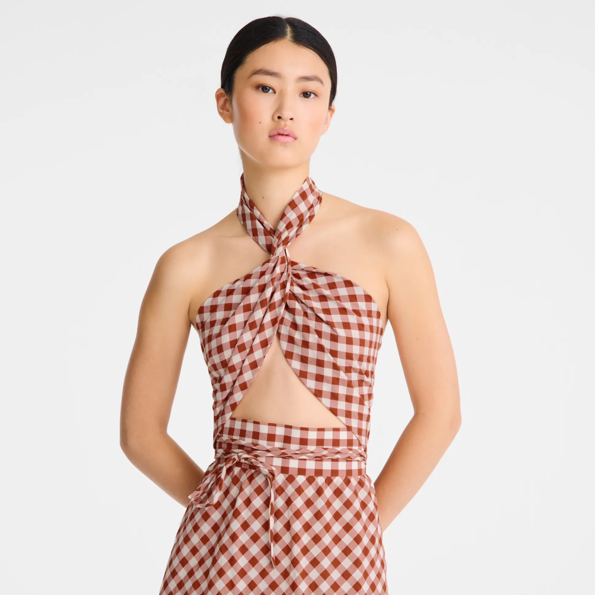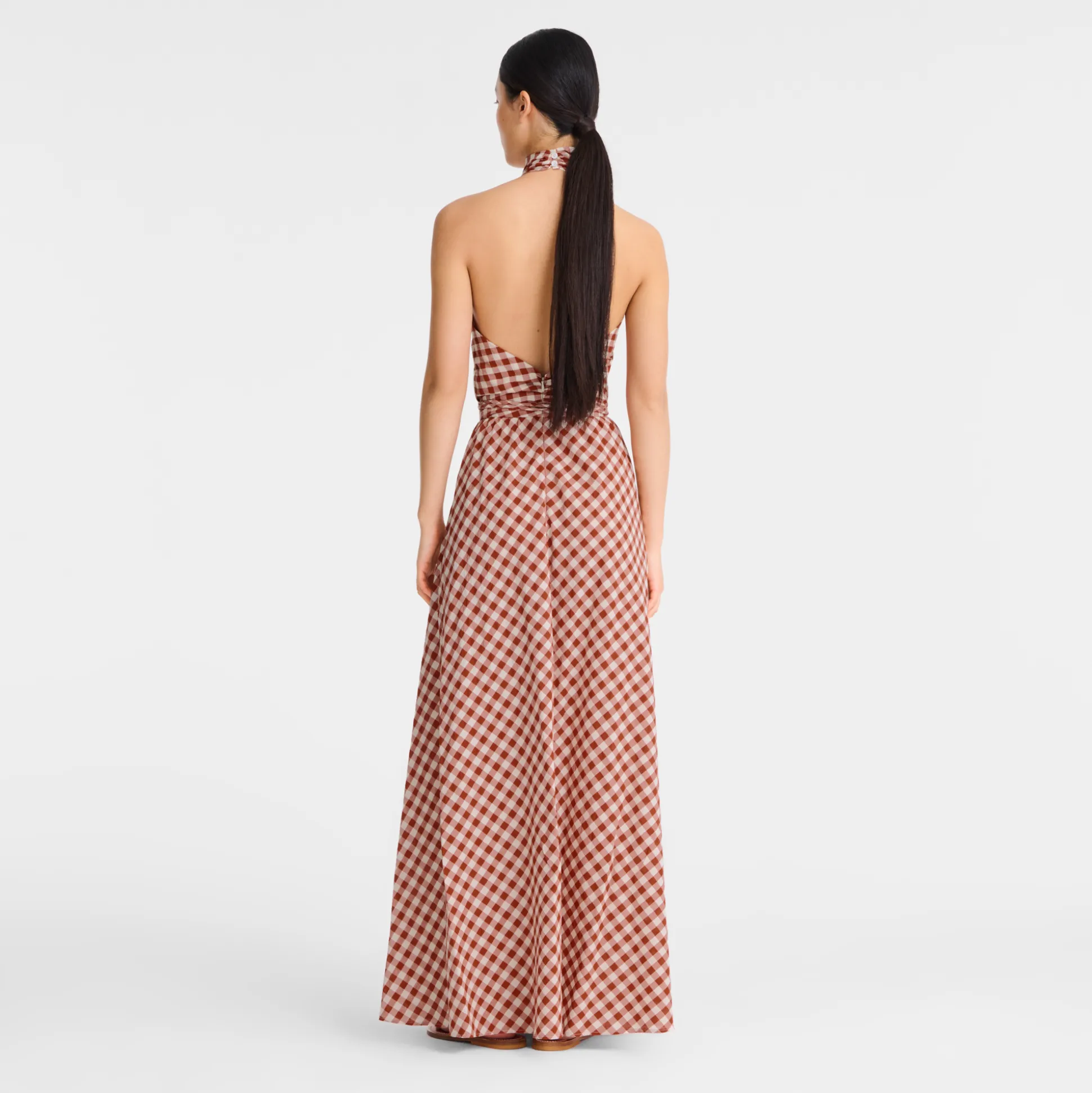 Questo maxi abito lungo a quadretti incarna l’eleganza casual della Maison. Il dettaglio intrecciato sullo scollo crea audaci aperture sul davanti, che rivelano delicatamente la pelle, mentre la schiena ha un raffinato taglio basso. Realizzato in cotone leggero, questo abito sprigiona un fascino estivo e femminile. Questa stagione, la collezione prêt-à-porter della Maison sprigiona un’energia fresca e vitale che richiama uno spirito libero e senza limiti. Ogni creazione riflette ottimismo, con dettagli che evocano una raffinata eleganza rustica, per un fascino contemporaneo e senza tempo. La donna parigina si muove con disinvoltura tra i ritmi vivaci e dinamici della Ville Lumière e i placidi paesaggi di campagna, con un guardaroba che spazia tra audaci tocchi di rosa e creazioni con motivi e colori ispirati dalle tonalità naturali di un rigoglioso orto verdeggiante. Rivelando con eleganza le molteplici sfaccettatura di sé, la donna Longchamp si adatta ad ogni contesto senza mai perdere il proprio stile, distintivo e innato.