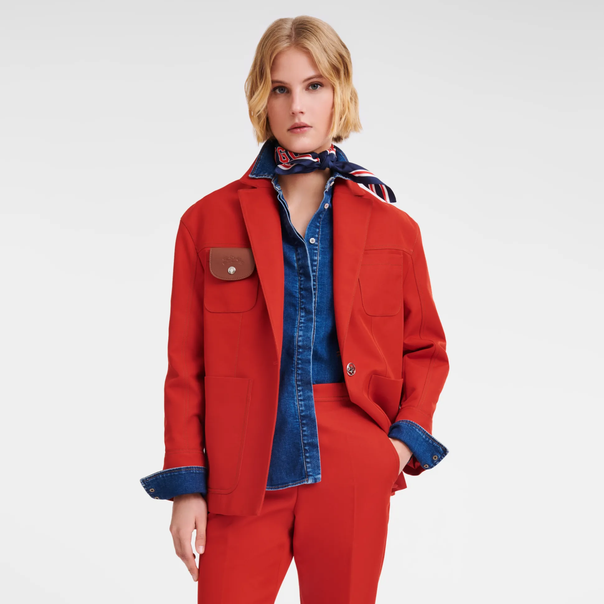 Questa giacca oversize Longchamp in gabardine è caratterizzata da dettagli unici, tra cui due grandi tasche applicate, un colletto sartoriale e una patta in pelle. Questa collezione è un inno alla libertà, perché ti invitiamo a viaggiare e scoprire il meglio di te. La Parisienne è poliedrica, infonde eleganza nei look casual quotidiani e nell’abbigliamento sportivo, esprimendo audacia e femminilità attraverso materiali e motivi giocosi, texture morbide e colori vibranti.