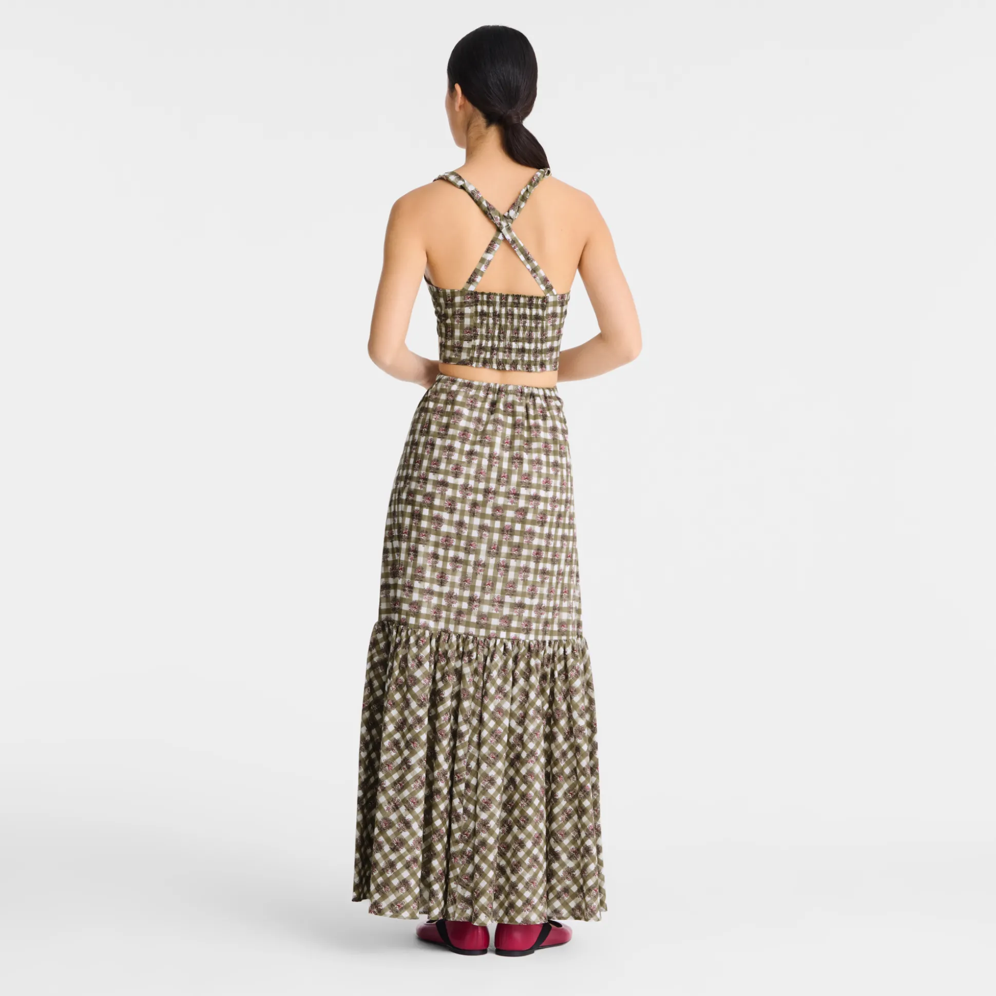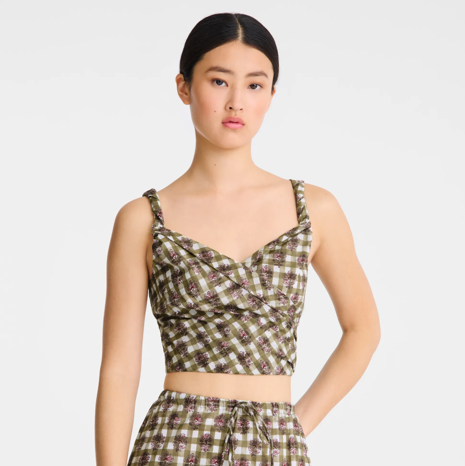 Icona essenziale della collezione Primavera-Estate 2025, questo top corto a quadretti offre un tocco di freschezza con i colori a contrasto e si abbina perfettamente alla gonna coordinata. Realizzato interamente in voile di cotone, è dotato di spalline sottili incrociate sulla schiena che conferiscono alla silhouette un fascino femminile e bucolico. Questa stagione, la collezione prêt-à-porter della Maison sprigiona un’energia fresca e vitale che richiama uno spirito libero e senza limiti. Ogni creazione riflette ottimismo, con dettagli che evocano una raffinata eleganza rustica, per un fascino contemporaneo e senza tempo. La donna parigina si muove con disinvoltura tra i ritmi vivaci e dinamici della Ville Lumière e i placidi paesaggi di campagna, con un guardaroba che spazia tra audaci tocchi di rosa e creazioni con motivi e colori ispirati dalle tonalità naturali di un rigoglioso orto verdeggiante. Rivelando con eleganza le molteplici sfaccettatura di sé, la donna Longchamp si adatta ad ogni contesto senza mai perdere il proprio stile, distintivo e innato.