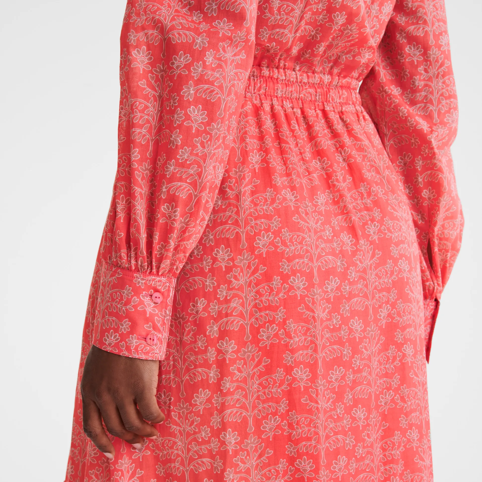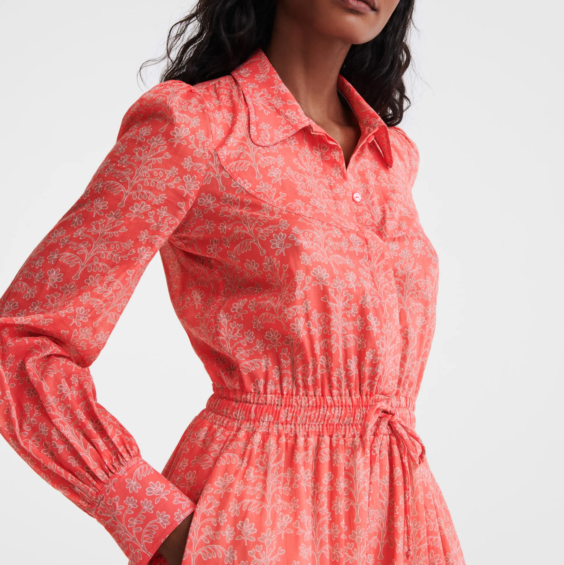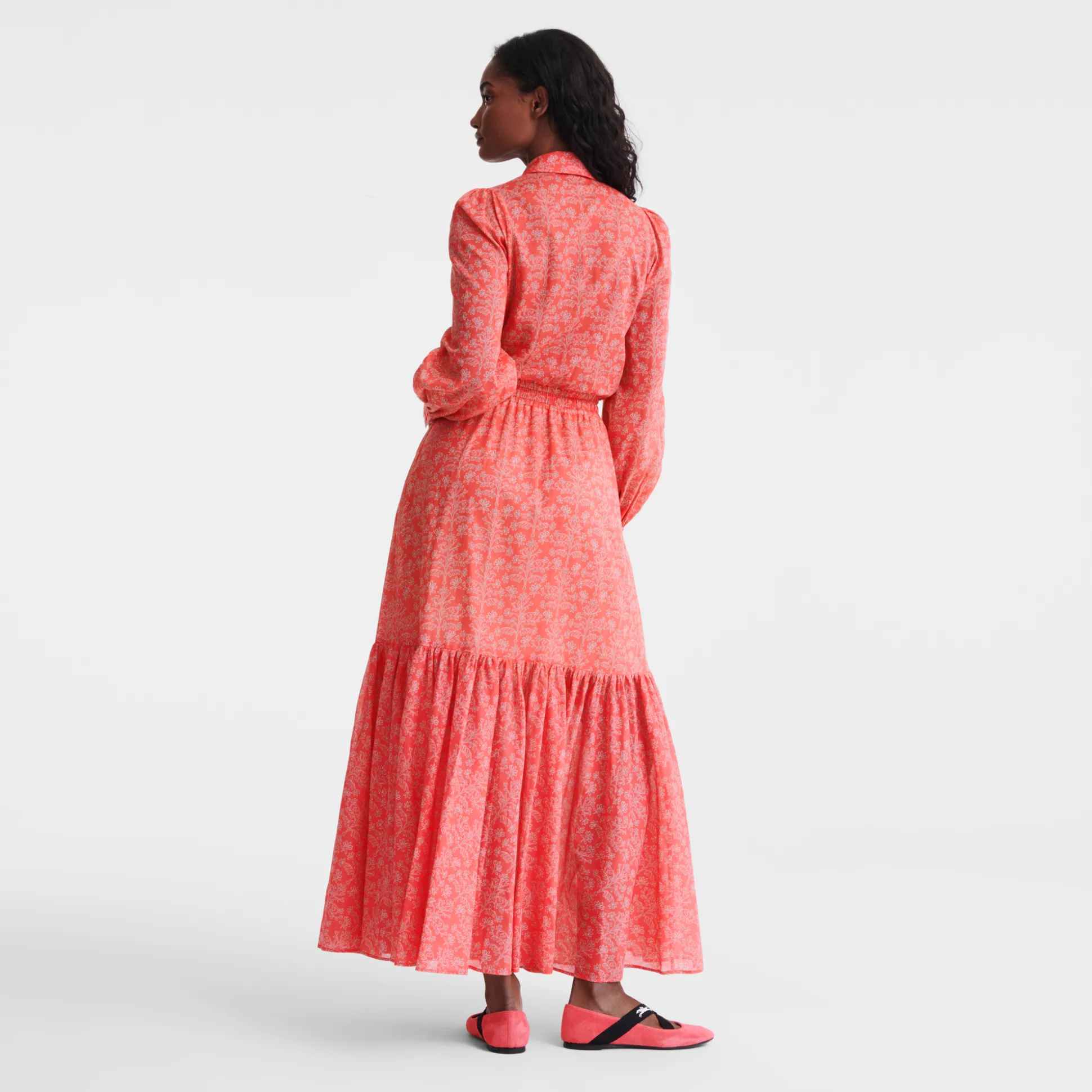 Questo maxi abito in voile di cotone stampato incarna lo spirito rustico e autentico della campagna. Con elementi come il colletto a camicia, le maniche lunghe e la cintura elastica che slancia la silhouette, offre un look femminile, rilassato e disinvolto. Questa stagione, la collezione prêt-à-porter della Maison sprigiona un’energia fresca e vitale che richiama uno spirito libero e senza limiti. Ogni creazione riflette ottimismo, con dettagli che evocano una raffinata eleganza rustica, per un fascino contemporaneo e senza tempo. La donna parigina si muove con disinvoltura tra i ritmi vivaci e dinamici della Ville Lumière e i placidi paesaggi di campagna, con un guardaroba che spazia tra audaci tocchi di rosa e creazioni con motivi e colori ispirati dalle tonalità naturali di un rigoglioso orto verdeggiante. Rivelando con eleganza le molteplici sfaccettatura di sé, la donna Longchamp si adatta ad ogni contesto senza mai perdere il proprio stile, distintivo e innato.