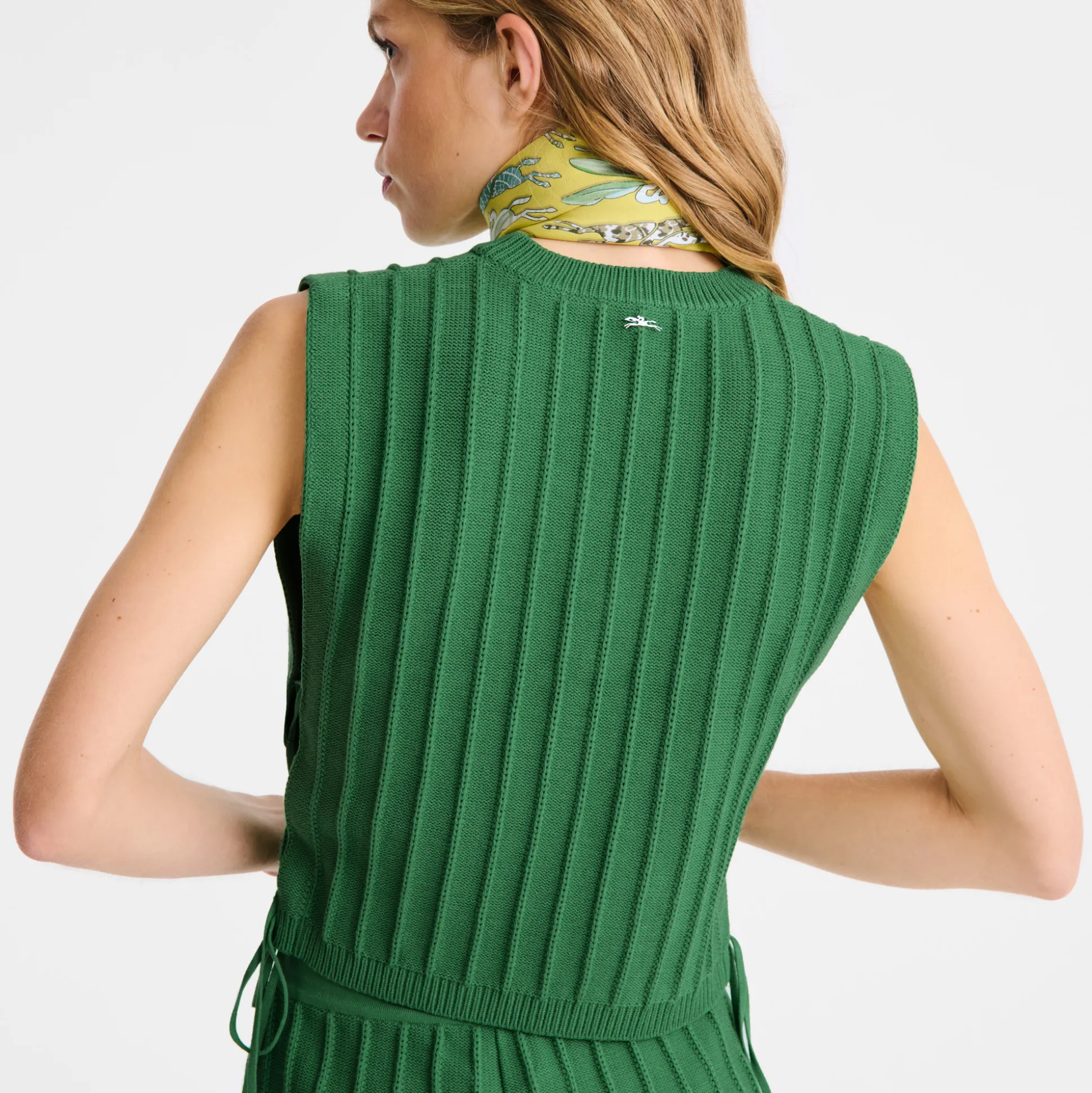 Questo top in rete è perfetto per chi è sempre in movimento e si abbina perfettamente agli shorts coordinati della stessa collezione. Caratterizzato da un motivo a coste larghe, uno scollo rotondo e coulisse regolabili sui lati, questo top elasticizzato e aderente offre sensualità e comfort. Indossalo direttamente a contatto con la pelle o sopra una camicetta o una maglietta. Questa stagione, la collezione prêt-à-porter della Maison sprigiona un’energia fresca e vitale che richiama uno spirito libero e senza limiti. Ogni creazione riflette ottimismo, con dettagli che evocano una raffinata eleganza rustica, per un fascino contemporaneo e senza tempo. La donna parigina si muove con disinvoltura tra i ritmi vivaci e dinamici della Ville Lumière e i placidi paesaggi di campagna, con un guardaroba che spazia tra audaci tocchi di rosa e creazioni con motivi e colori ispirati dalle tonalità naturali di un rigoglioso orto verdeggiante. Rivelando con eleganza le molteplici sfaccettatura di sé, la donna Longchamp si adatta ad ogni contesto senza mai perdere il proprio stile, distintivo e innato.