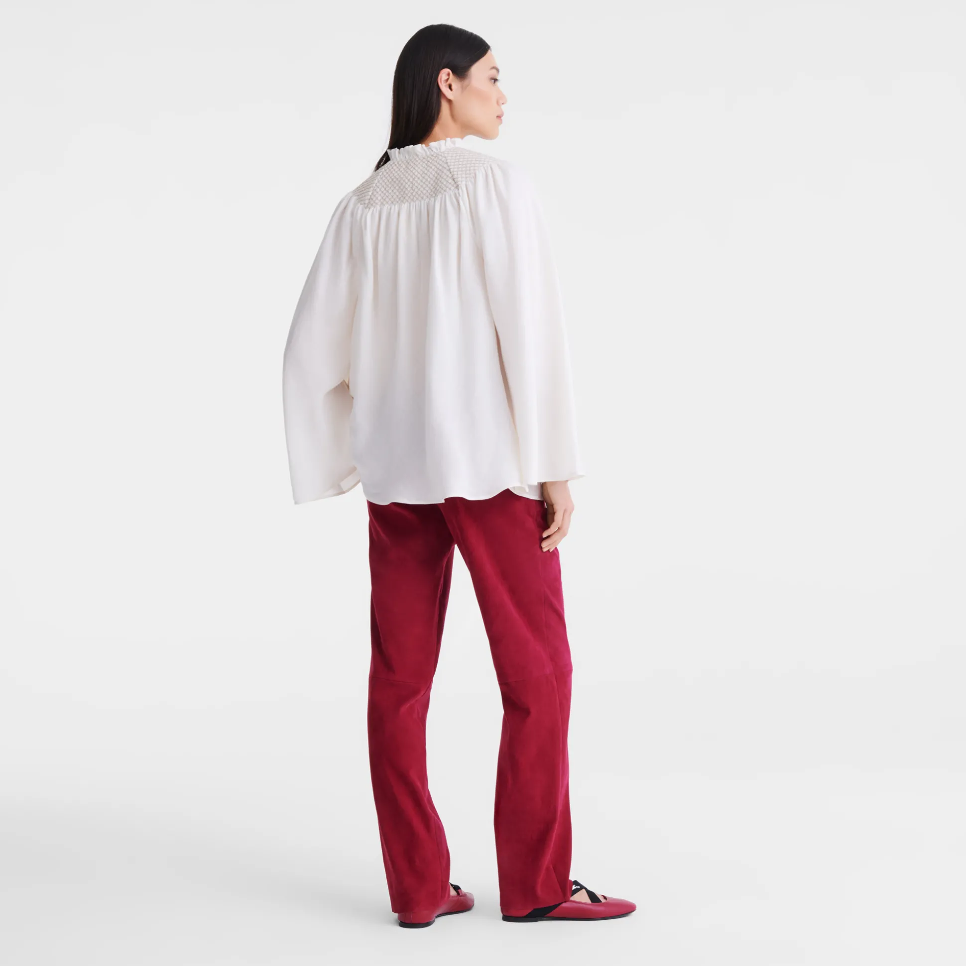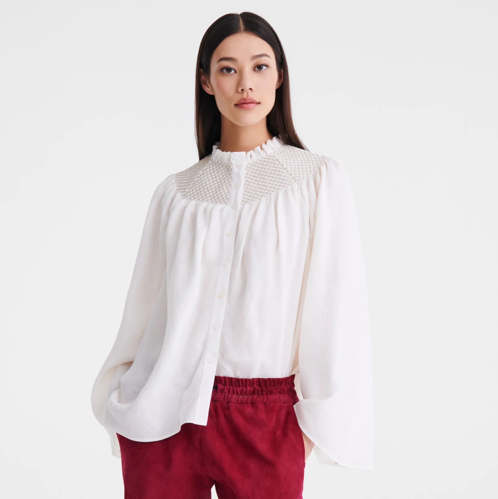 Questa camicetta a maniche lunghe con colletto arricciato ricamato in un colore a contrasto può essere lasciata cadere sopra i pantaloni o una gonna. Realizzata in ramiè naturale, presenta drappeggi fluidi ed è morbida sulla pelle. Il suo design senza tempo si adatta a qualsiasi silhouette. Questa stagione, la collezione prêt-à-porter della Maison sprigiona un’energia fresca e vitale che richiama uno spirito libero e senza limiti. Ogni creazione riflette ottimismo, con dettagli che evocano una raffinata eleganza rustica, per un fascino contemporaneo e senza tempo. La donna parigina si muove con disinvoltura tra i ritmi vivaci e dinamici della Ville Lumière e i placidi paesaggi di campagna, con un guardaroba che spazia tra audaci tocchi di rosa e creazioni con motivi e colori ispirati dalle tonalità naturali di un rigoglioso orto verdeggiante. Rivelando con eleganza le molteplici sfaccettatura di sé, la donna Longchamp si adatta ad ogni contesto senza mai perdere il proprio stile, distintivo e innato.