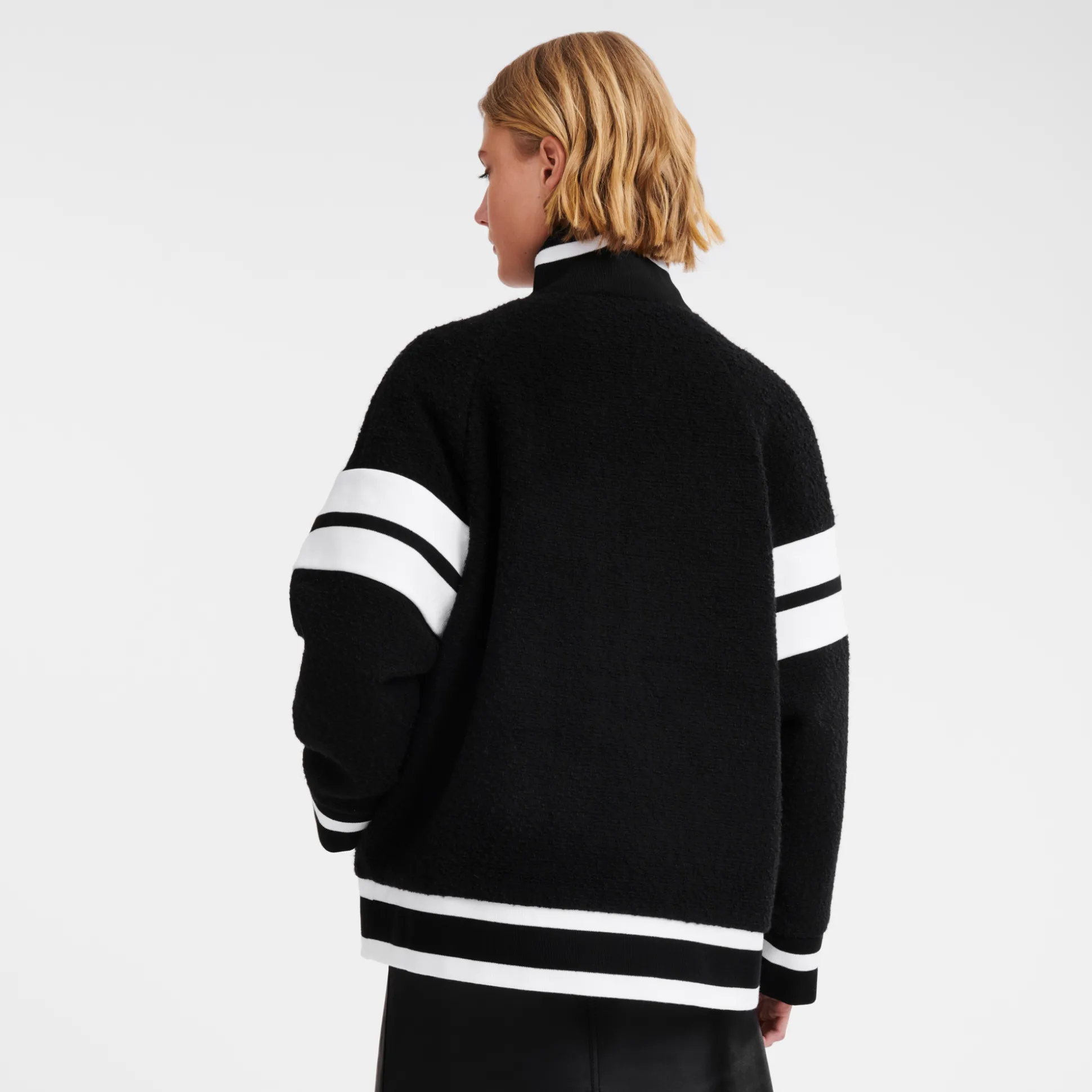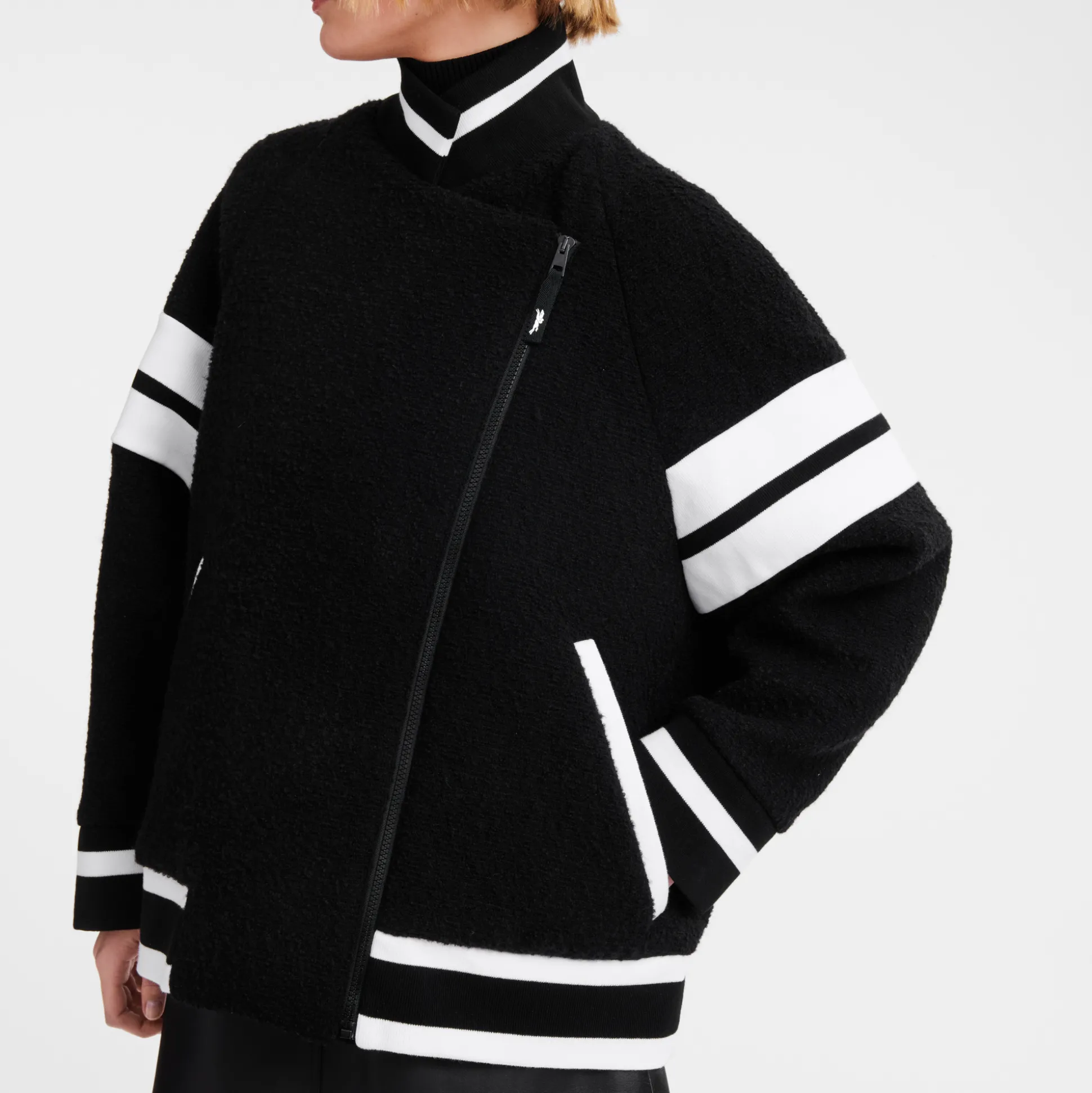 Progettata con un taglio oversize, questa giacca in lana bouclette è calda, trendy e con esclusivi inserti a coste su colletto, polsini e orlo per un tocco sportivo. Questa collezione è un inno alla libertà, perché ti invitiamo a viaggiare e scoprire il meglio di te. La Parisienne è poliedrica, infonde eleganza nei look casual quotidiani e nell’abbigliamento sportivo, esprimendo audacia e femminilità attraverso materiali e motivi giocosi, texture morbide e colori vibranti.
