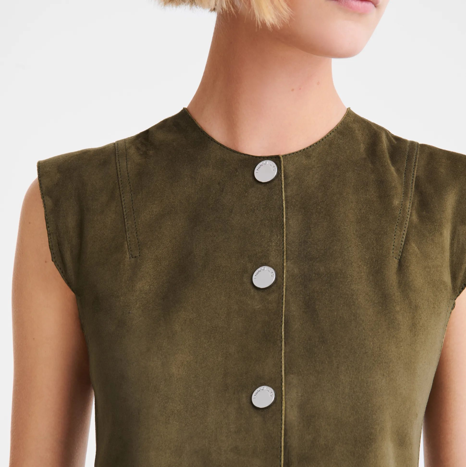 La giacca senza maniche in pelle di agnello scamosciata incarna lo spirito rilassato e raffinato della campagna. Questa giacca dal taglio dritto e strutturato presenta intagli grafici sull’orlo e sotto le ascelle. Versatile ed elegante, può essere indossata chiusa come un elegante top o aperta per un look casual. Questa stagione, la collezione prêt-à-porter della Maison sprigiona un’energia fresca e vitale che richiama uno spirito libero e senza limiti. Ogni creazione riflette ottimismo, con dettagli che evocano una raffinata eleganza rustica, per un fascino contemporaneo e senza tempo. La donna parigina si muove con disinvoltura tra i ritmi vivaci e dinamici della Ville Lumière e i placidi paesaggi di campagna, con un guardaroba che spazia tra audaci tocchi di rosa e creazioni con motivi e colori ispirati dalle tonalità naturali di un rigoglioso orto verdeggiante. Rivelando con eleganza le molteplici sfaccettatura di sé, la donna Longchamp si adatta ad ogni contesto senza mai perdere il proprio stile, distintivo e innato.