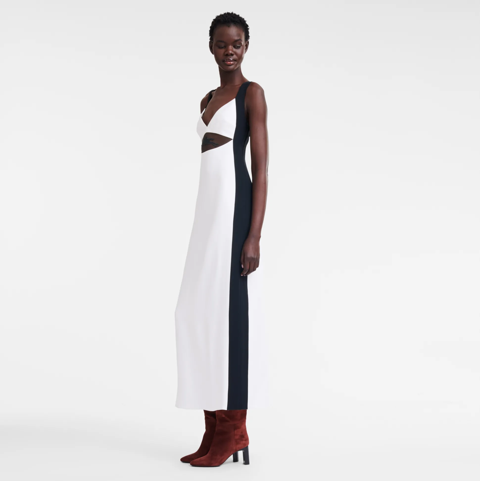 Outlet Longchamp Abito lungo con cintura con applicazione Bianco/Nero
