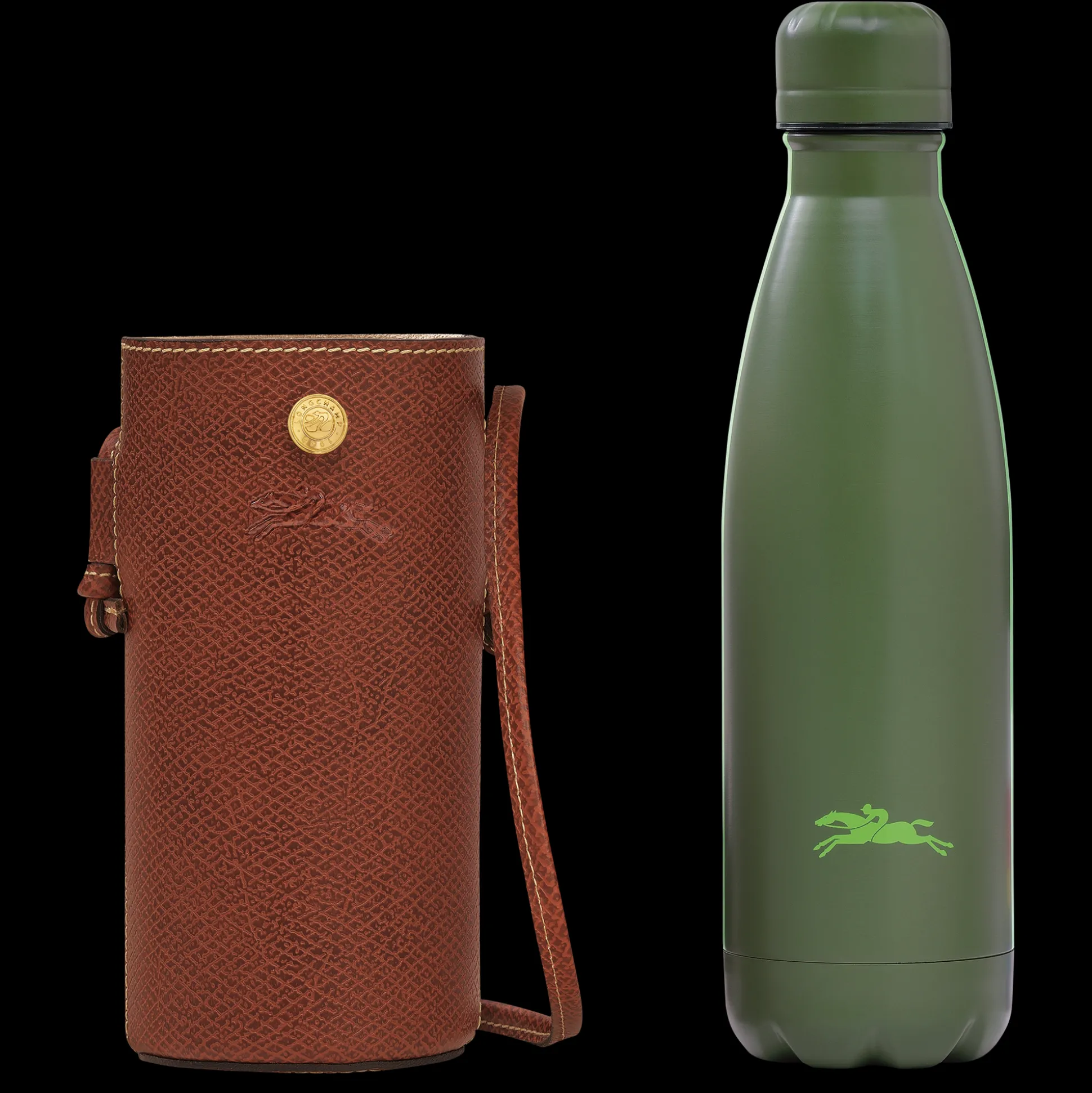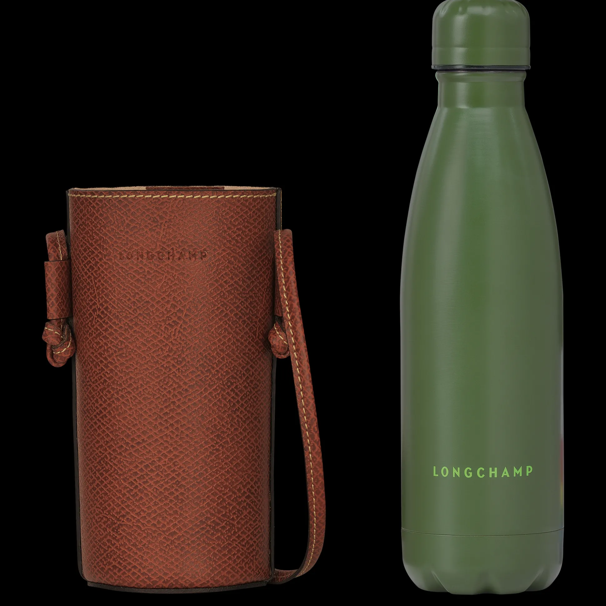 Manténgase hidratado fuera de casa con esta botella y soporte isotérmico de 500 ml, adornado con la firma Longchamp.